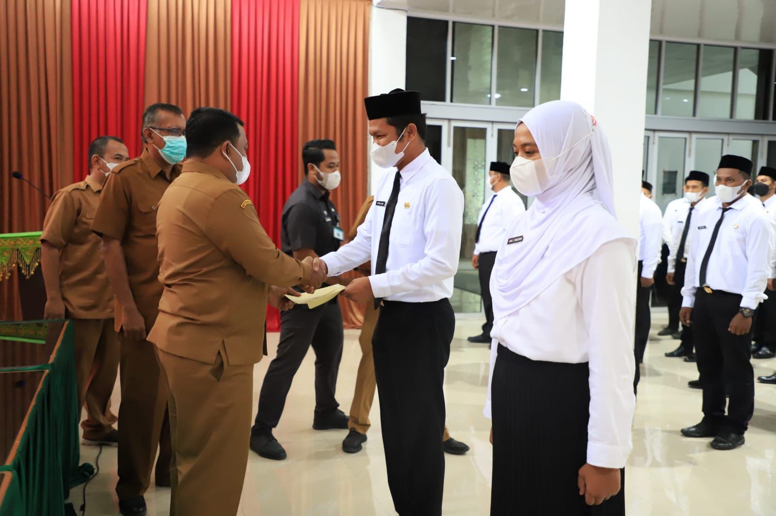 Aceh Besar- Sekretaris daerah Aceh Besar, Drs Sulaimi M.Si mewakili Bupati Aceh Besar menyerahkan Surat Keputusan (SK) Formasi Umum tahun 2020 kepada 123 PNS di Aula Dekranasda, Desa Gani, Kecamatan Ingin Jaya, Selasa, (5/4/2022).