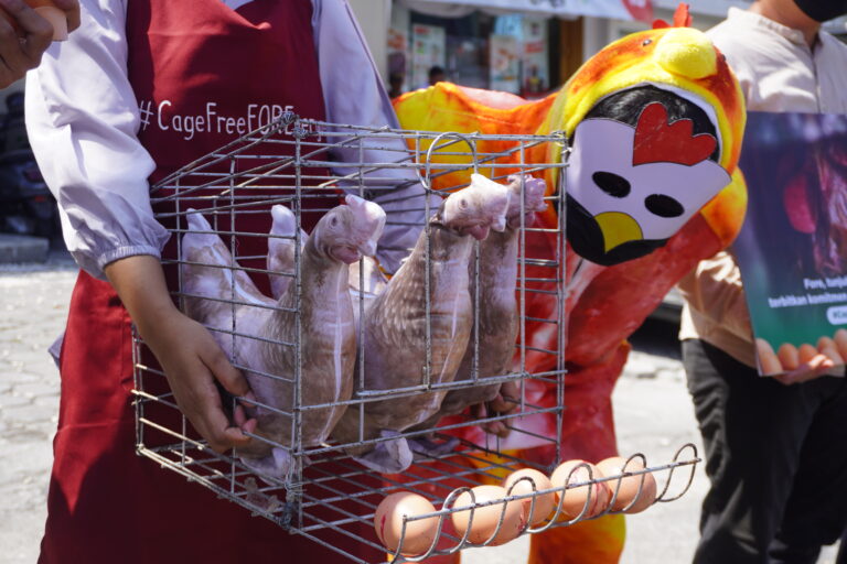 Aksi teatrikal mendesak pentingnya untuk terapkan peternakan ayam tanpa kandang demi kesehatan ayam dan manusia. Foto: AFJ