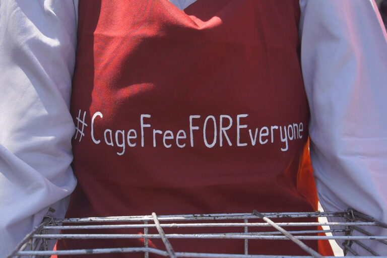 Aksi di Fore untuk mendesak mereka gunakan telur-telur dari kandang-kandang yang berpraktik baik seperti peternakan tanpa kandang. Foto: AFJ