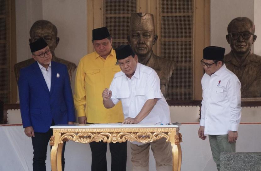 Partai Golkar dan Partai Amanat Nasional (PAN) resmi meneken kerja sama untuk mendukung Prabowo Subianto sebagai bakal calon presiden, di Museum Perumusan Naskah Proklamasi, Jakarta, Ahad (13/8/2023).