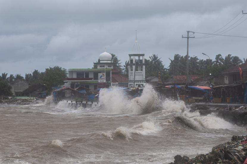 Gelombang tinggi disertai angin kencang menerjang kawasan tersebut di Teluk Labuan, Pandeglang, Banten. BMKG mengimbau masyarakat waspadai tsunami malam hari seiring Anak Krakatau siaga.