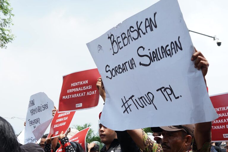 Aksi Masyarakat Adat Keturunan Ompu Umbak Siallagan Dolok Parmonangan, menuntut pembebasan ketua komunitas adatnya. Foto: AMAN Tano Batak