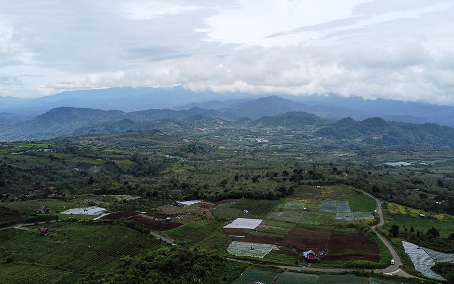 Lanskap perbukitan Gunung Patah terlihat dari sekitar kebun warga di Desa Agung Lawangan. Lanskap ini disebut Basemah libar yang menjadi ruang hidup Suku Besemah. Foto drone: Ariadi Damara/Mongabay Indonesia