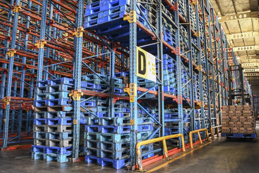 Seorang pegawai membongkar muat kardus berisi margarin di samping rak penyimpanan minyak goreng yang kosong di gudang PT Salim Ivomas Pratama di Tanjung Priok, Jakarta, Selasa (15/3/2022). Dinas Perindustrian, Perdagangan, Koperasi, Usaha Kecil dan Menengah (PPKUKM) DKI Jakarta bersama Polda Metro Jaya melakukan inspeksi mendadak (sidak) di gudang tersebut untuk memastikan kewajiban memproduksi sebanyak 350 ribu liter minyak goreng per bulan yang akan didistribusikan kepada masyarakat.