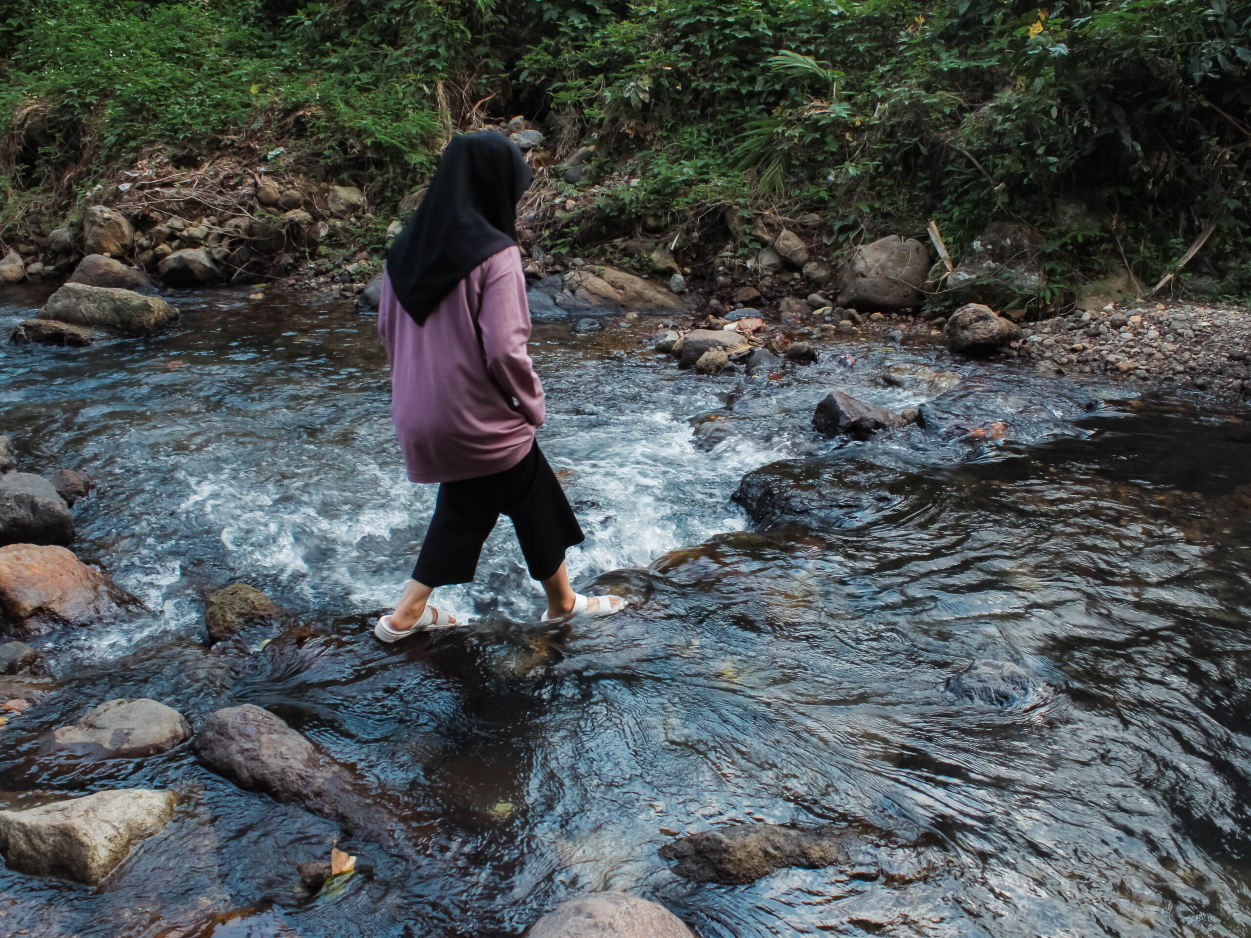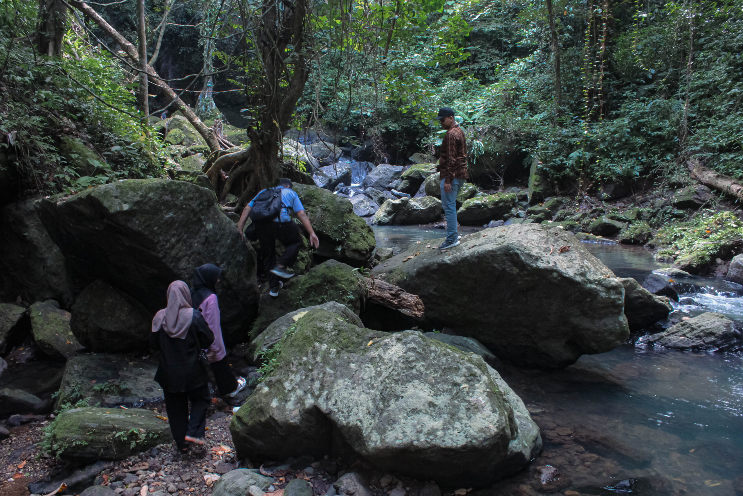 Beberapa kali wisatawan harus menyeberangi aliran sungai dangkal untuk mencapai lokasi air terjun. Foto: Mardili/Lensakita.com