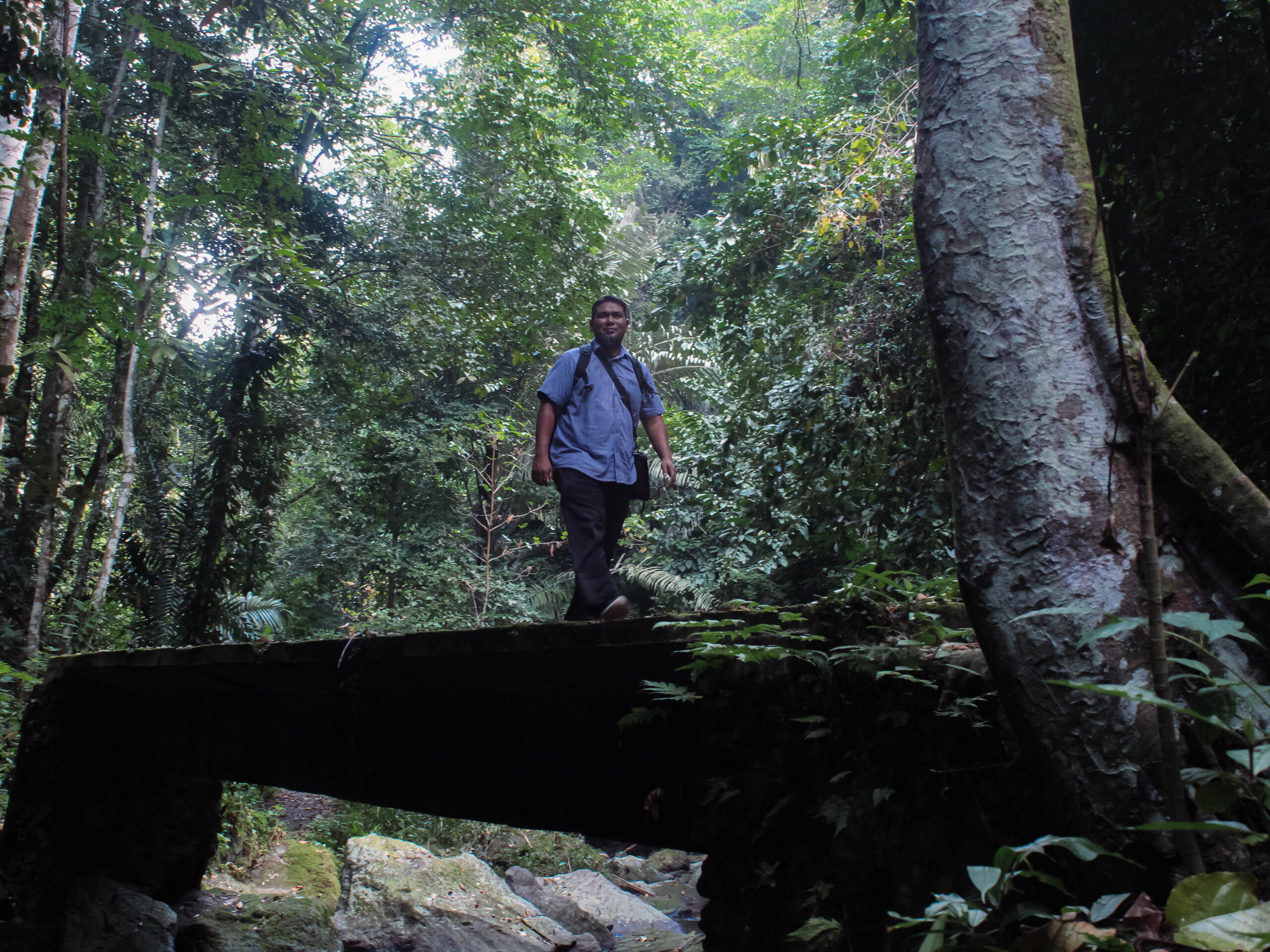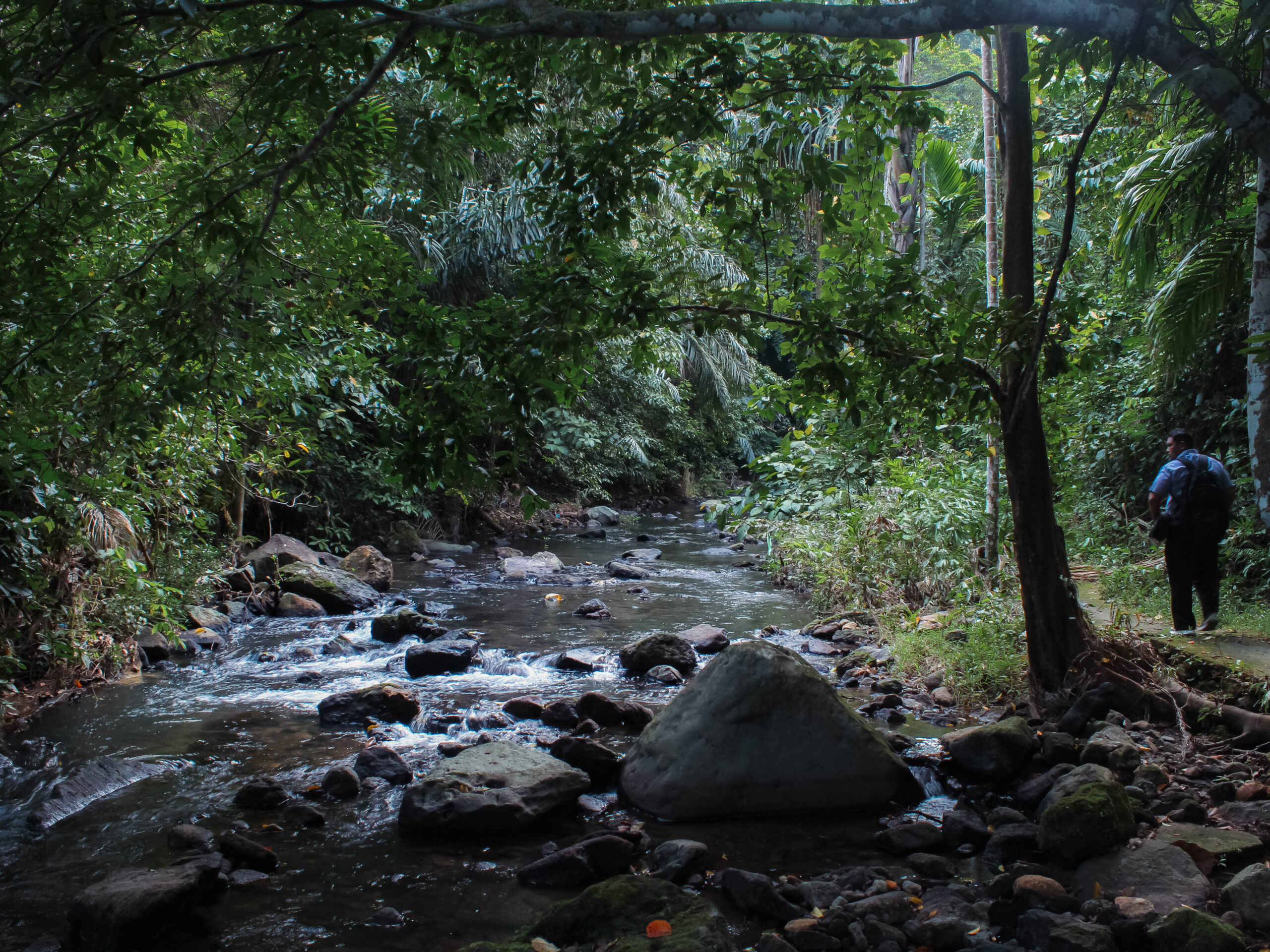 Suasana alami dengan pepohonan yang rindang dan aliran sungai sepanjang jalan menuju lokasi Air Terjun Pria Laot, Jumat (24/2/2023). Foto: Mardili/Lensakita.com
