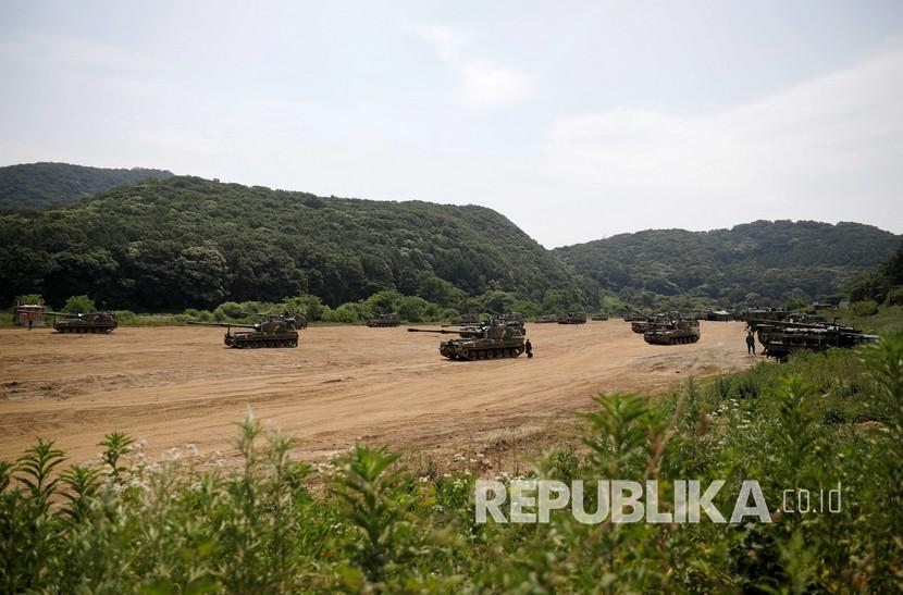 Seorang tentara Korea Selatan mengambil bagian dalam latihan penembakan langsung di dekat zona demiliterisasi yang memisahkan kedua Korea di Paju, Korea Selatan, Selasa (23/6).