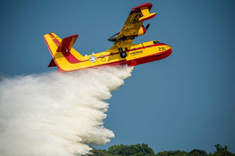 Sebuah Canadair CL-215 (Scooper) menjatuhkan air selama Demonstrasi Pemadaman Kebakaran Udara | Gambar: USDA oleh Preston Keres (Public Domain)