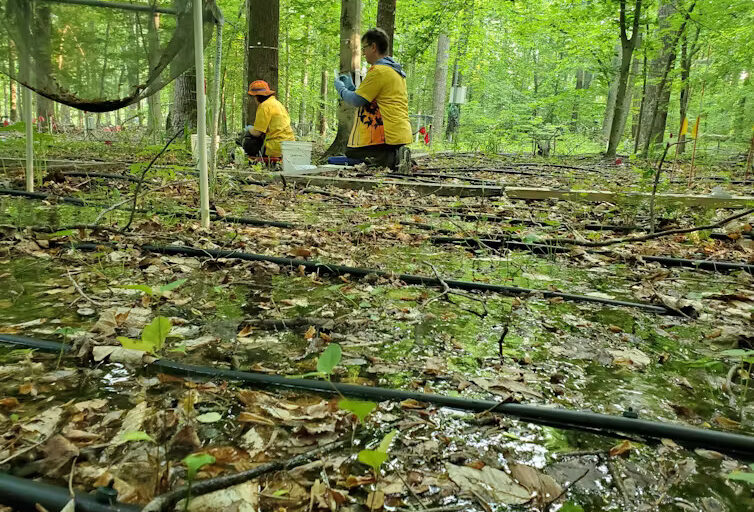 Para ilmuwan bekerja di plot uji di mana eksperimen air asin menunjukkan dampak kenaikan permukaan laut pada hutan pesisir | Gambar: Alice Stearns/Pusat Penelitian Lingkungan Smithsonian.