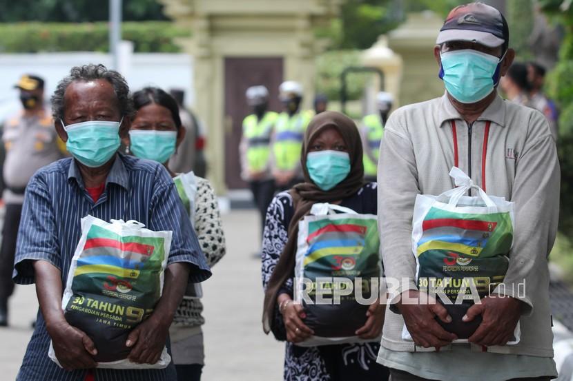 Warga membawa paket sembako yang diterimanya di Tugu Pahlawan, Surabaya, Jawa Timur, Senin (7/3/2022). Sebanyak 800 paket sembako didistribusikan ke masyarakat dalam rangka Bakti Sosial Persada Akabri 92 tersebut untuk membantu meringankan ekonomi masyarakat terdampak pandemi COVID-19.