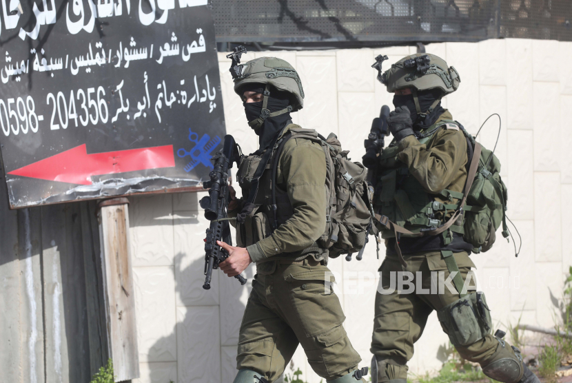 Pasukan keamanan Israel menggeledah rumah warga Palestina di desa Yabad, Tepi Barat, dekat Jenin, 30 Maret 2022. Pasukan Israel menggerebek desa itu dalam operasi pencarian. Terduga penembak yang membunuh lima warga Israel di kota Bnei Brak, Israel tengah, Diaa Hamarsheh, berasal dari desa Yabad. Hamarsheh, 27, dibunuh oleh polisi pada 29 Maret.