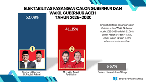 Dimana, berdasarkan survei terbaru yang dilakukan oleh Bravo Fanta Institute, elektabilitas Bustami-Fadhi jauh mengalahkan Mualem-Dekfad.