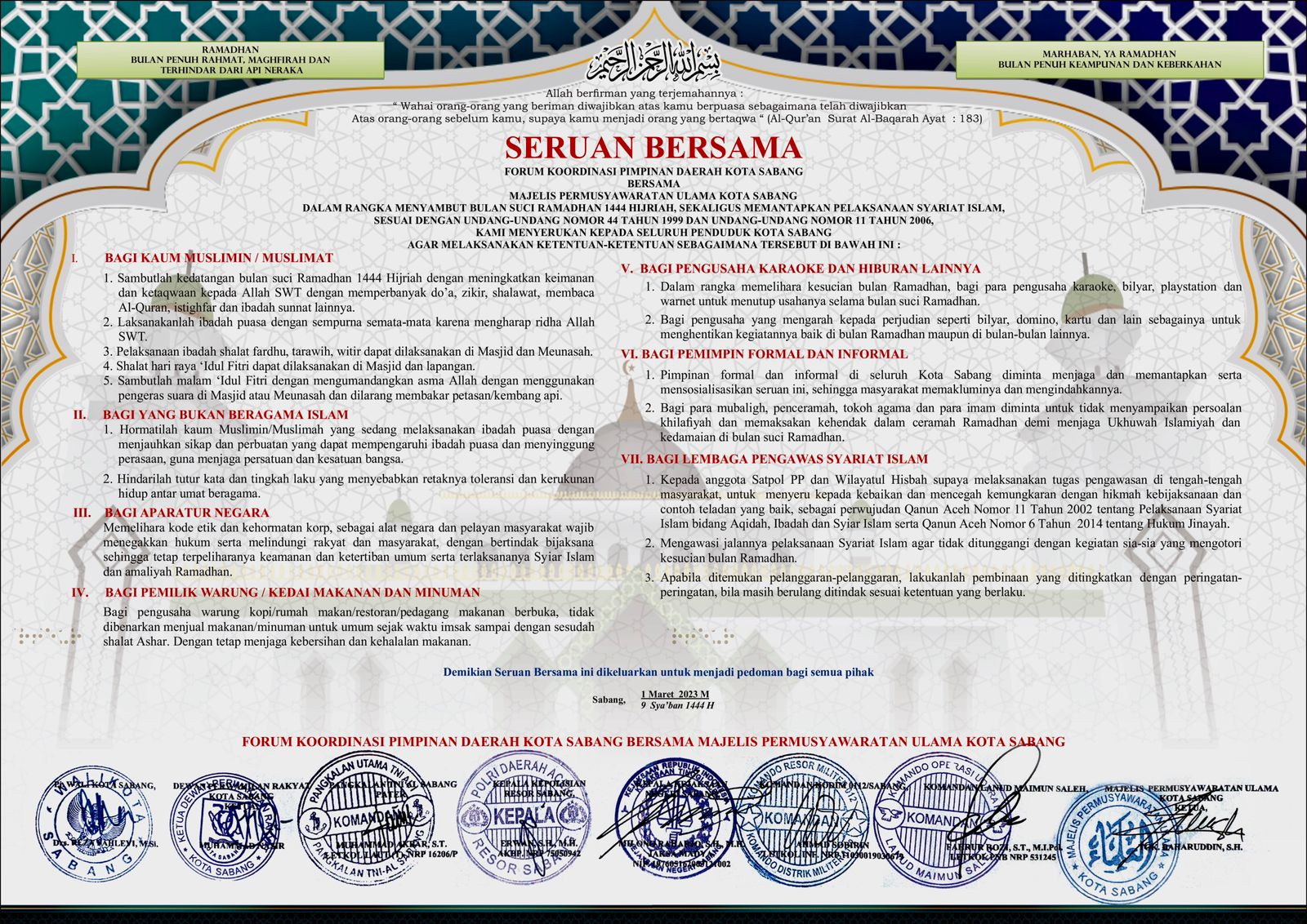 SABANG – Forkopimda Kota Sabang bersama Majelis Permusyawaratan Ulama Kota Sabang keluarkan seruan bersama dan imbauan, terkait pelaksanaan ibadah selama bulan bulan suci Ramadan 1444 Hijriah.