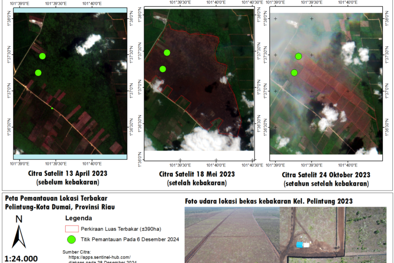 - Di Pelintung, Kota Dumai, Riau, Gambut yang terbakar tahun 2023 dijual, dan sudah ditanami hingga 14 petak. Luas bervariasi, antara empat sampai enam hektar per petak.