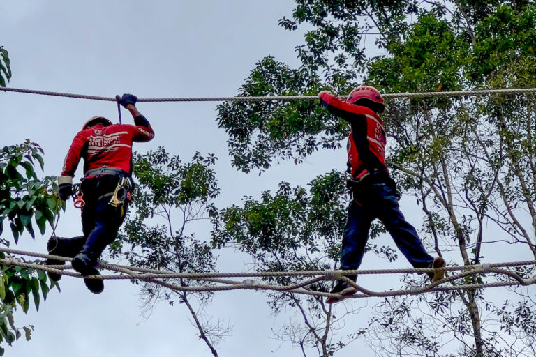 Tim dari Yayasan Tangguh Hutan Khatulistiwa (TaHuKah) dan Vertical Rescue Indonesia membangun jembatan kanopi untuk konektivitas primata di provinsi Sumatera Utara, Indonesia. Dok: TaHuKah.
