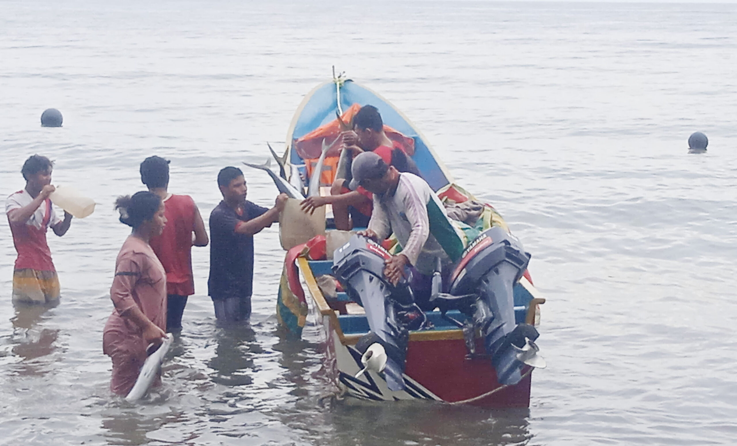 Fandi Hole, menepikan perahunya di Pantai Desa Momojiu, Kabupaten Pulau Morotai, Maluku Utara (Malut) akhir Desember 2024 lalu. Ibu dan keponakannya yang sedari tadi menunggu di pinggir pantai membantu menurunkan hasil tangkapan.
