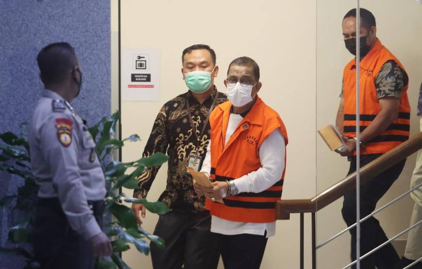 Wali Kota Ambon Richard Louhennapessy (kedua kanan) dan Staf Tata Usaha Pimpinan Pemkot Ambon Andrew Erin Hehanussa (kanan) mengenakan rompi tahanan KPK usai menjalani pemeriksaan di Gedung KPK Merah Putih, Jakarta, Jumat (13/5/2022). Richard Louhennapessy dan Andrew Erin Hehanussa, ditetapkan sebagai tersangkan dan ditahan terkait dugaan menerima suap dari Karyawan Alfa Midi Kota Ambon Amri (masih buron), sebagai pelicin penerbitan Surat Izin Tempat Usaha (SITU), Surat Izin Usaha Perdagangan (SIUP) dan Persetujuan Prinsip Pembangunan sejumlah gerai minimarket di Kota Ambon tahun 2020.