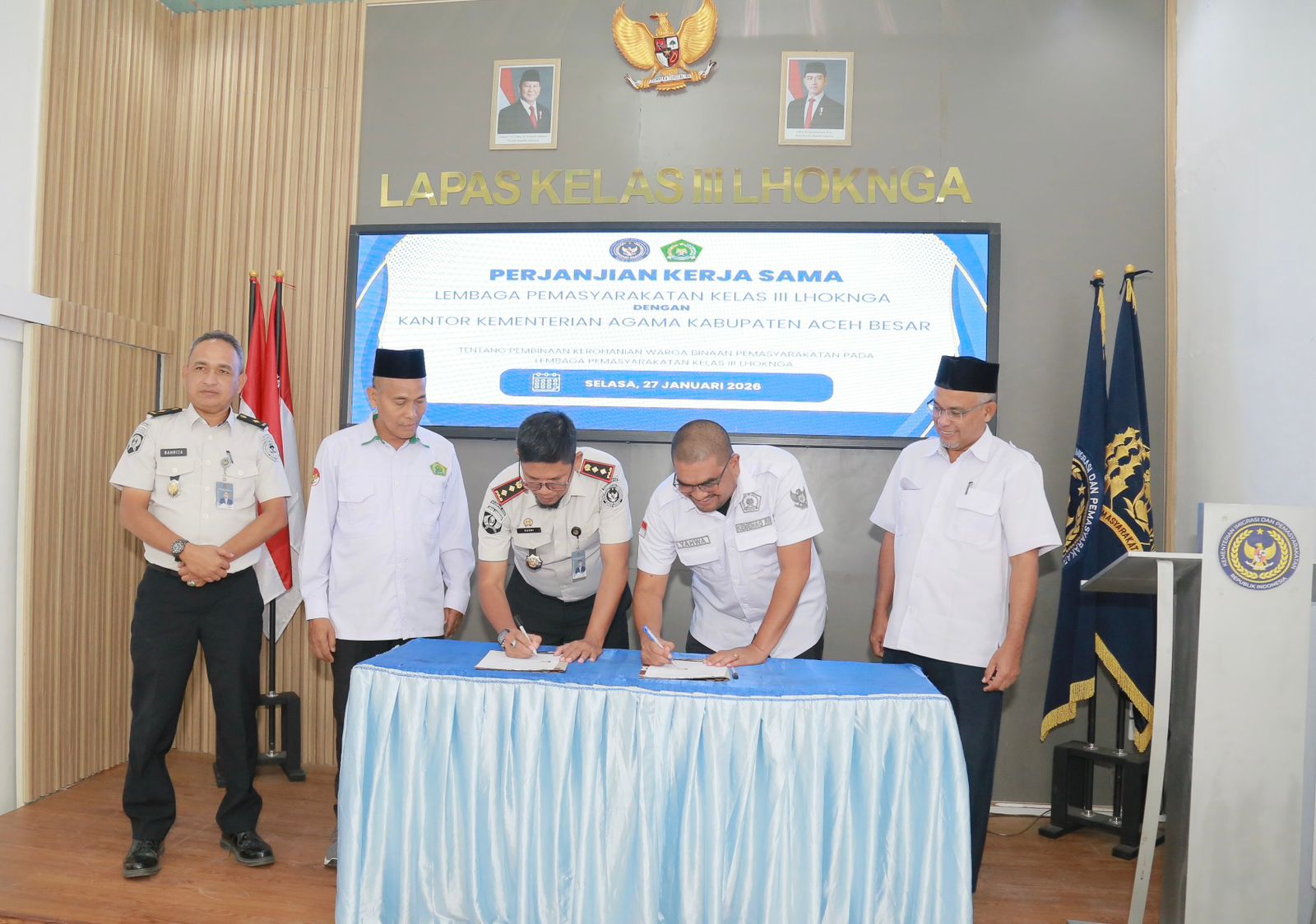 Perjanjian kerjasama diteken langsung Kepala Kantor Kemenag Aceh Besar Saifuddin dan Kepala Lapas Kelas III Lhoknga Husni di Lapas Lhoknga, Aceh Besar, Selasa (27/1/2026). Turut hadir Kasi Bimas Islam Khalid Wardana, jajaran KUA dan penyuluh agama Islam.