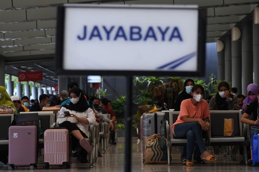 Calon penumpang menunggu kedatangan keretanya di Stasiun Pasar Senen, Jakarta Pusat, Kamis (7/4/2022). Presiden Joko Widodo memperkirakan sekitar 85 juta orang akan mudik Lebaran pada tahun 2022 ini dan sekitar 14 juta diantaranya berasal dari Jabodetabek.