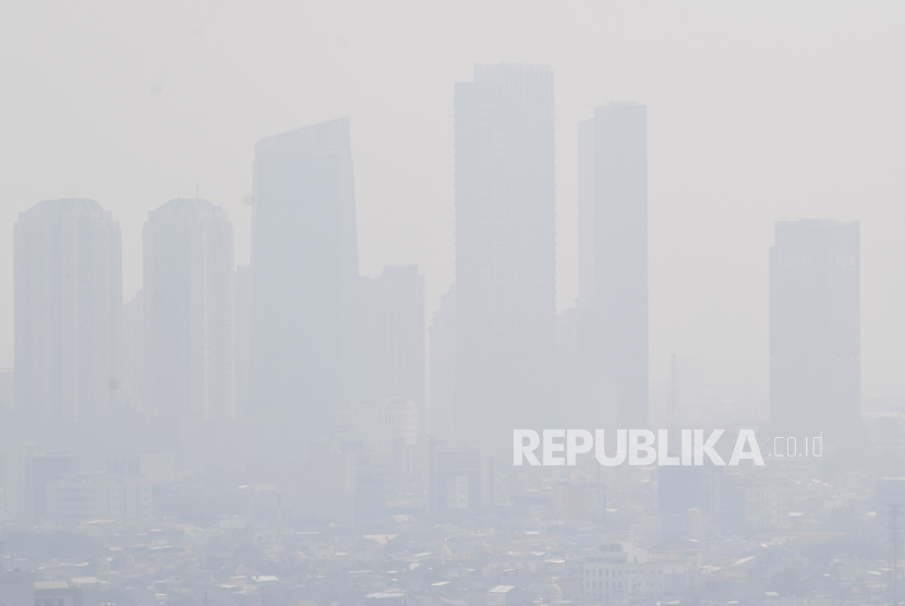 Deretan gedung bertingkat yang tertutup polusi di Jakarta. Pemerintah Indonesia menggunakan sejumlah sumber daya ramah lingkungan dan pendanaan untuk meningkatkan penggunaan transportasi umum.