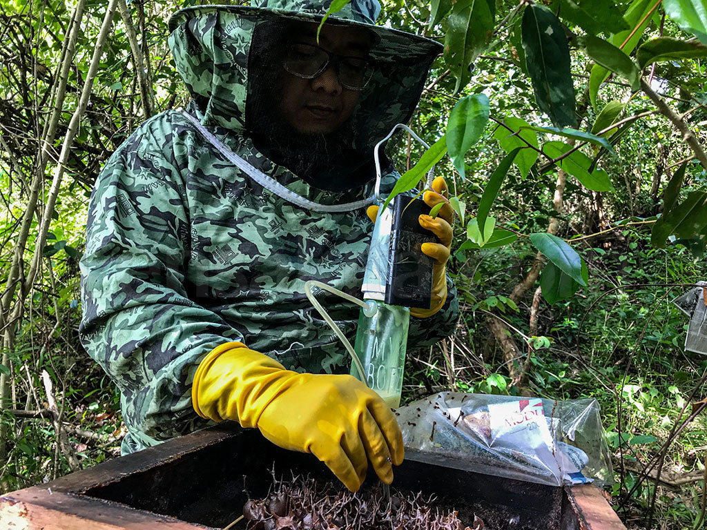 Herwan Mauliza,  sedang memanen madu linot budidaya miliknya yang berada di Blang Bintang, Aceh Besar, Selasa 13 September 2022.