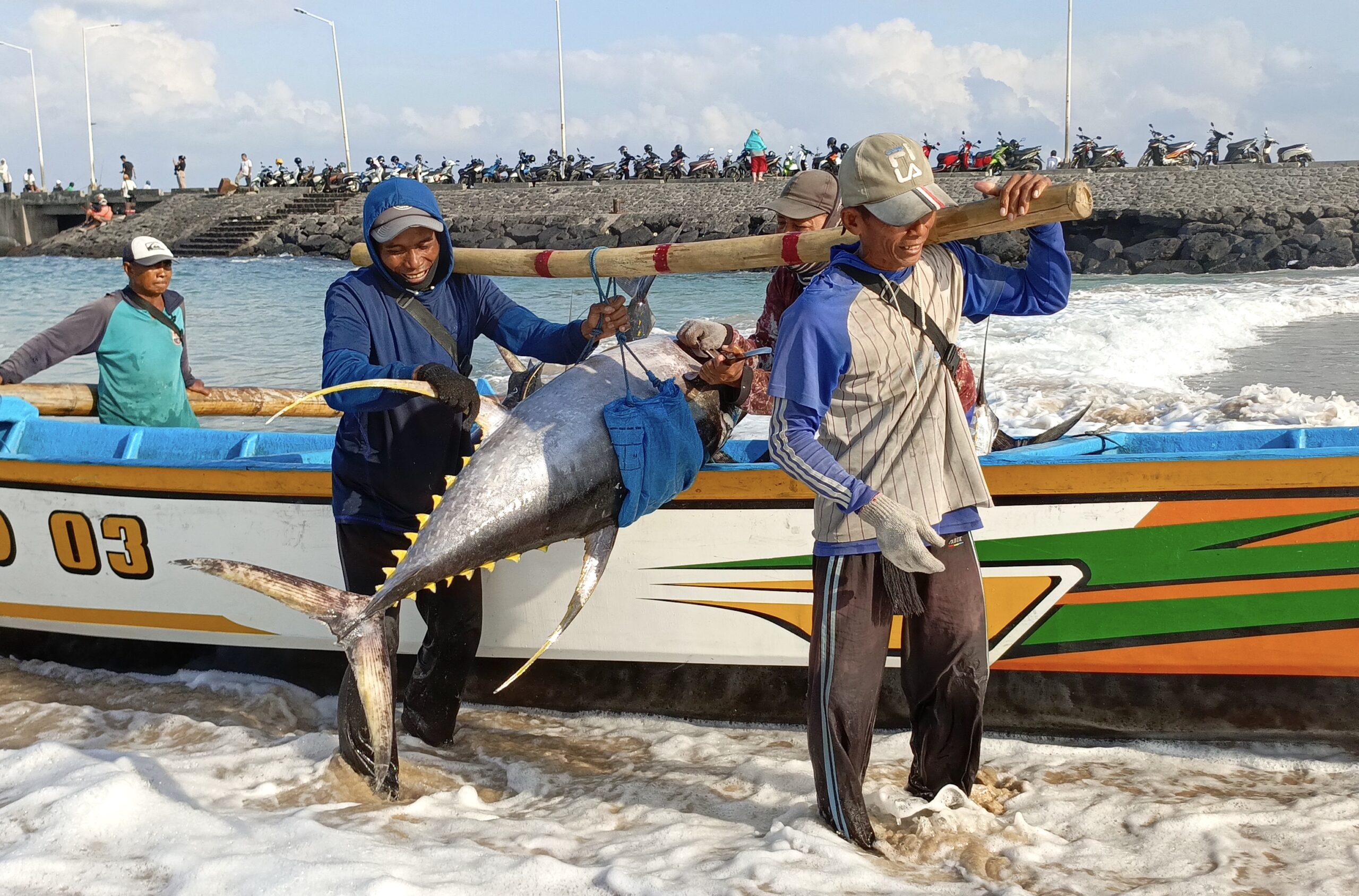 Dua buruh angkut memikul hasil tangkapan ikan tuna di Pelabuhan tradisional di Kedonganan, Badung, Bali. Foto : A. Asnawi/Mongabay Indonesia