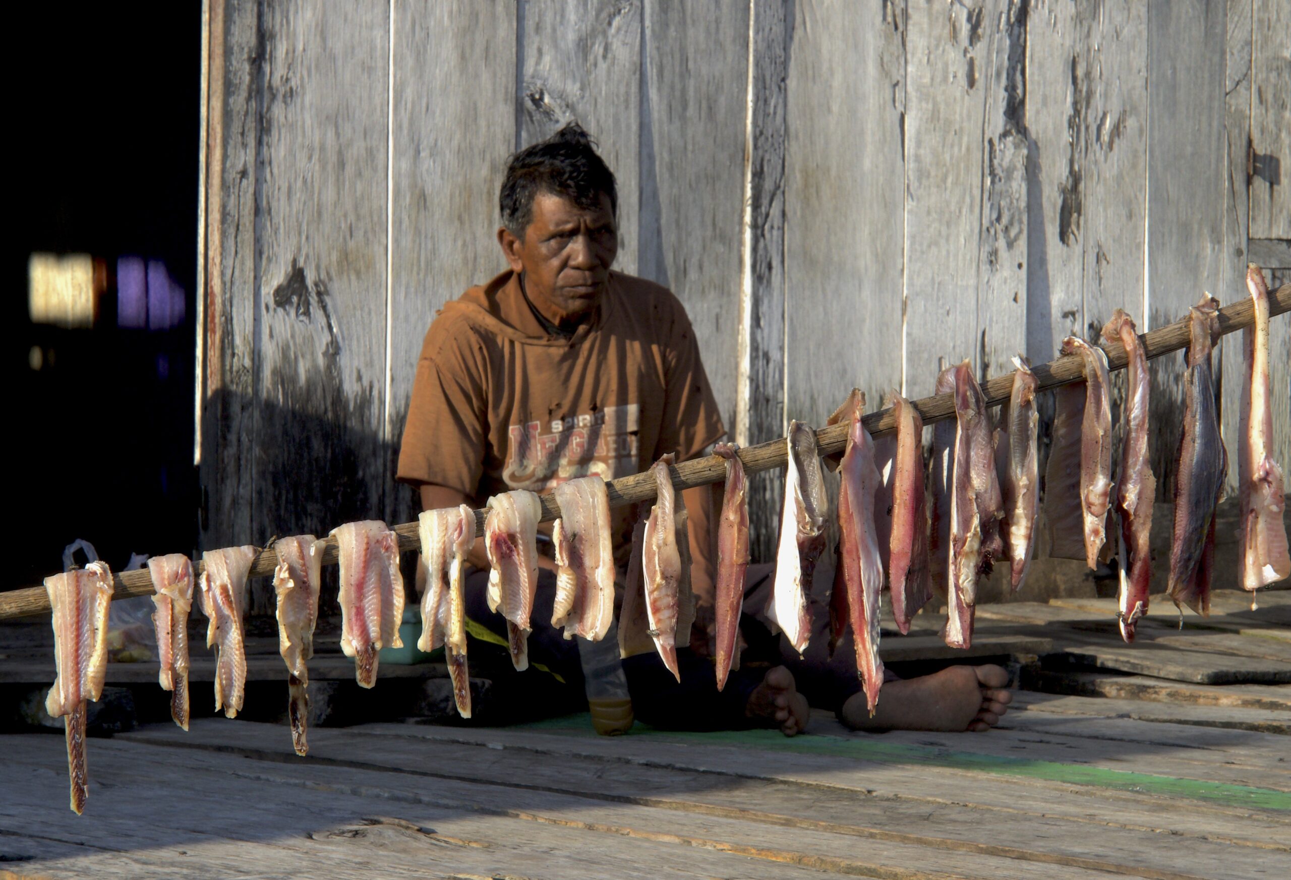 Nelayan Desa Lobuton, Totikum Selatan, Banggai Kepulauan, Sulawesi Tengah, menjemur daging ikan pari yang ditangkap di lautan lepas. Foto: Riza Salman/Mongabay Indonesia