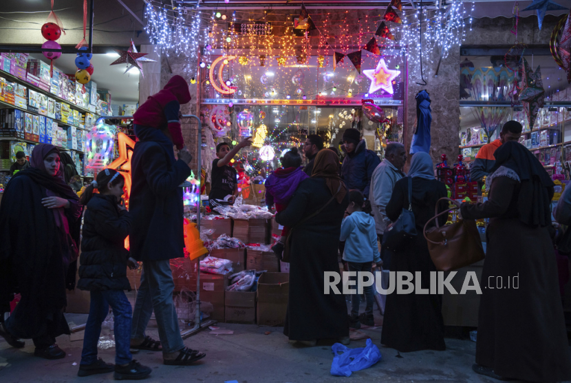 Warga Palestina berbelanja lampu pesta dan dekorasi lainnya di pasar Zawiya menjelang bulan suci Ramadhan, di Kota Gaza.