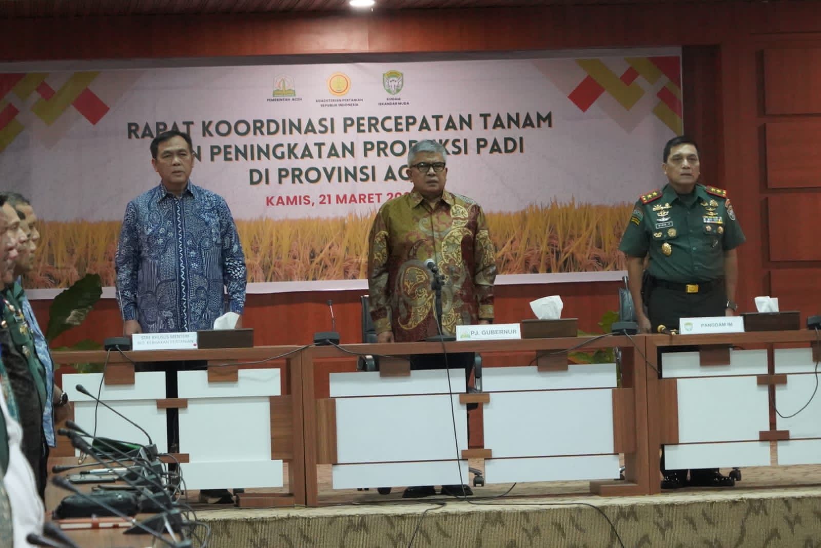 Hadir dalam acara rapat tersebut Pj Gubernur Aceh, Staf Khusus Menteri Bidang Kebijakan Pertanian, Sekretaris Badan Penyuluhan dan Pengembangan SDM Pertanian, Danrem 011/LW dan Danrem 012/TU, Aster Kasdam IM, Para Dandim Jajaran Kodam Iskandar Muda.