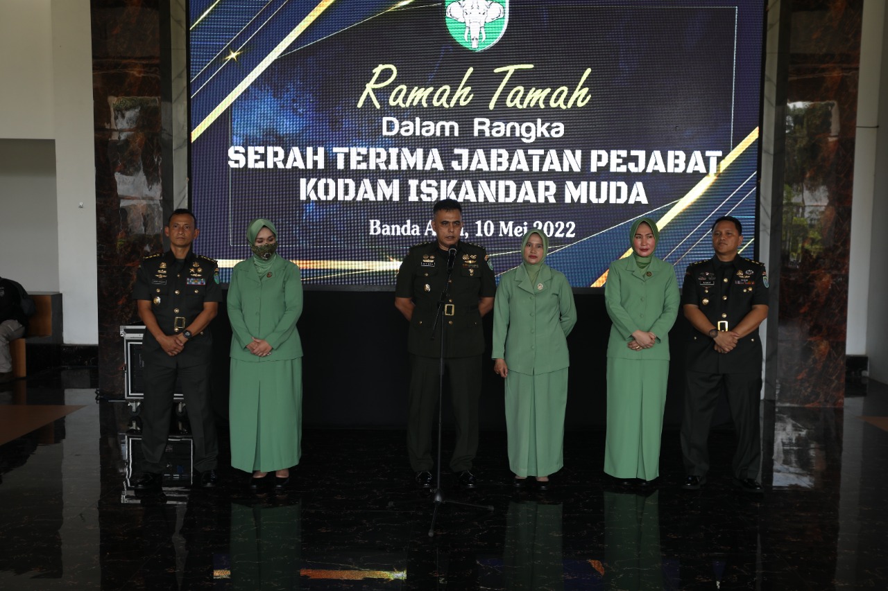 BANDA ACEH | LENSA KITA – Panglima Kodam Iskandar Muda (Pangdam IM), Mayor Jenderal TNI Mohamad Hasan memimpin serah terima jabatan (Sertijab) pejabat Kodam Iskandar Muda (IM) di Gedung Malahayati Makodam IM, Banda Aceh, Selasa (10/5/2022).