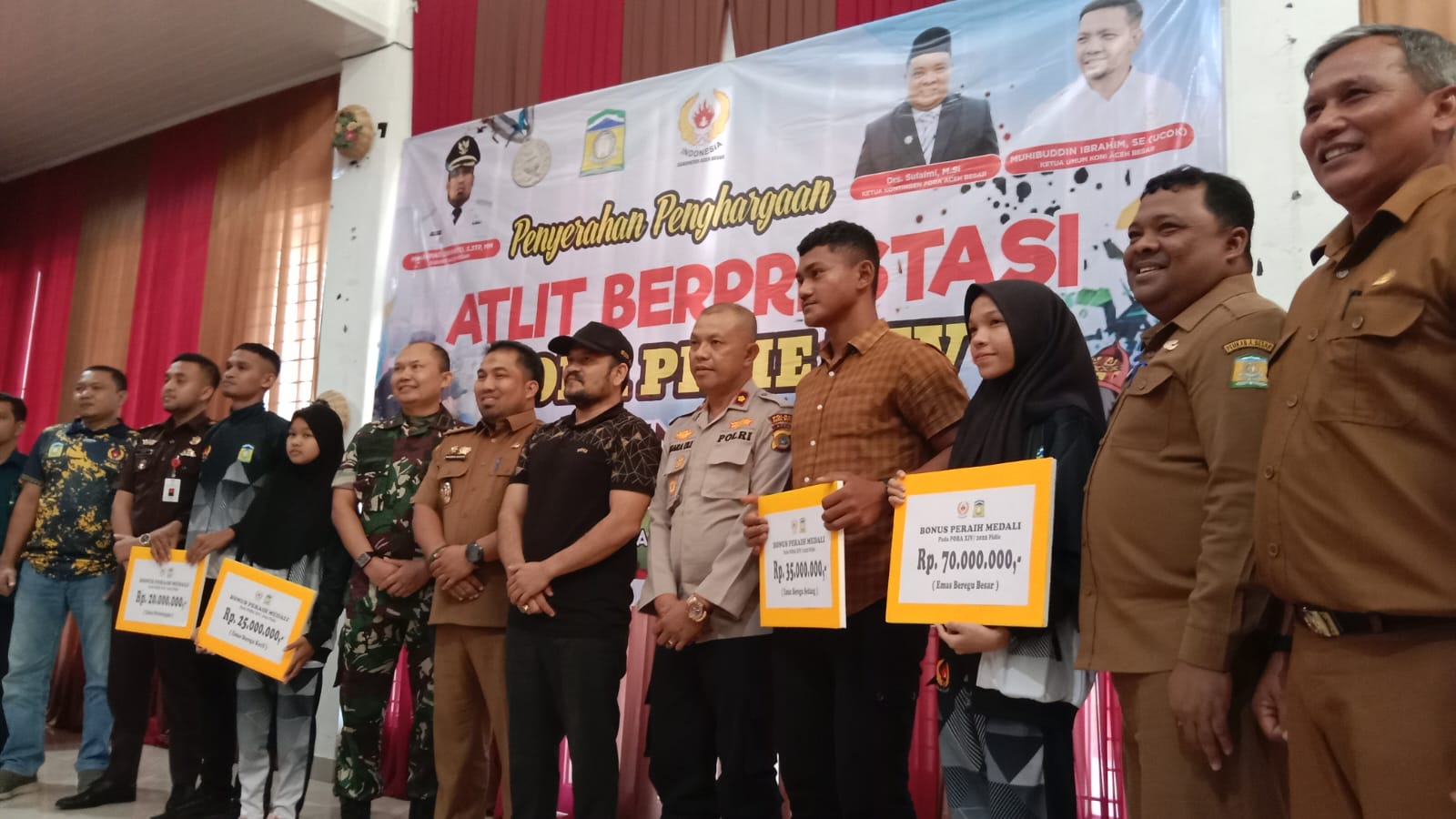 JANTHO – Penjabat (Pj) Bupati Aceh Besar Muhammad Iswanto, menyerahkan bonus kepada para atlet dan pelatih yang berhasil meraih medali pada Pekan Olahraga Aceh (PORA) ke-14 di Kabupaten Pidie tahun 2022.