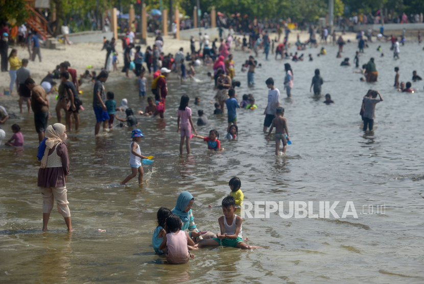 Pengunjung memadati kawasan Pantai Ancol di Taman Impian Jaya Ancol, Jakarta, Sabtu (7/5/2022). Kawasan wisata Taman Impian Jaya Ancol.