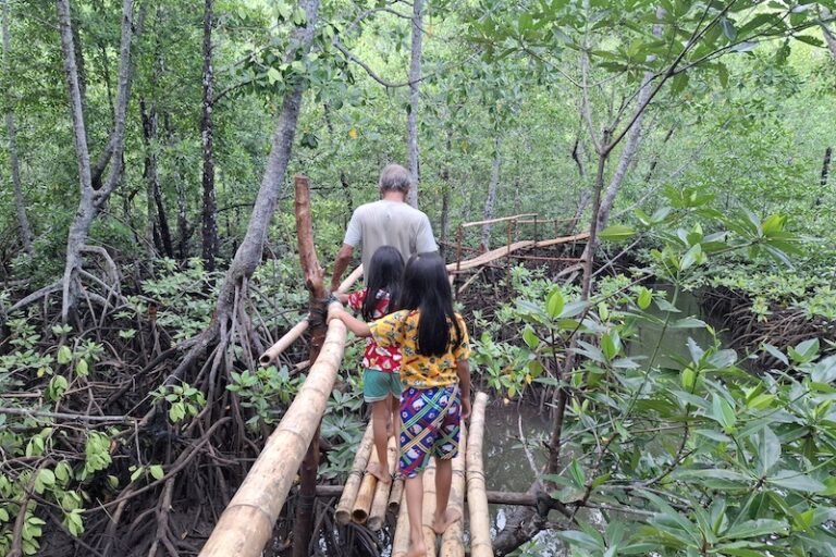 Opa Agus, bersama cucu di hutan Pulau Sangihe. Mereka berharap, Sangihe tak hilang karena tambang. Foto: Christopel Paino/Mongabay Indonesia
