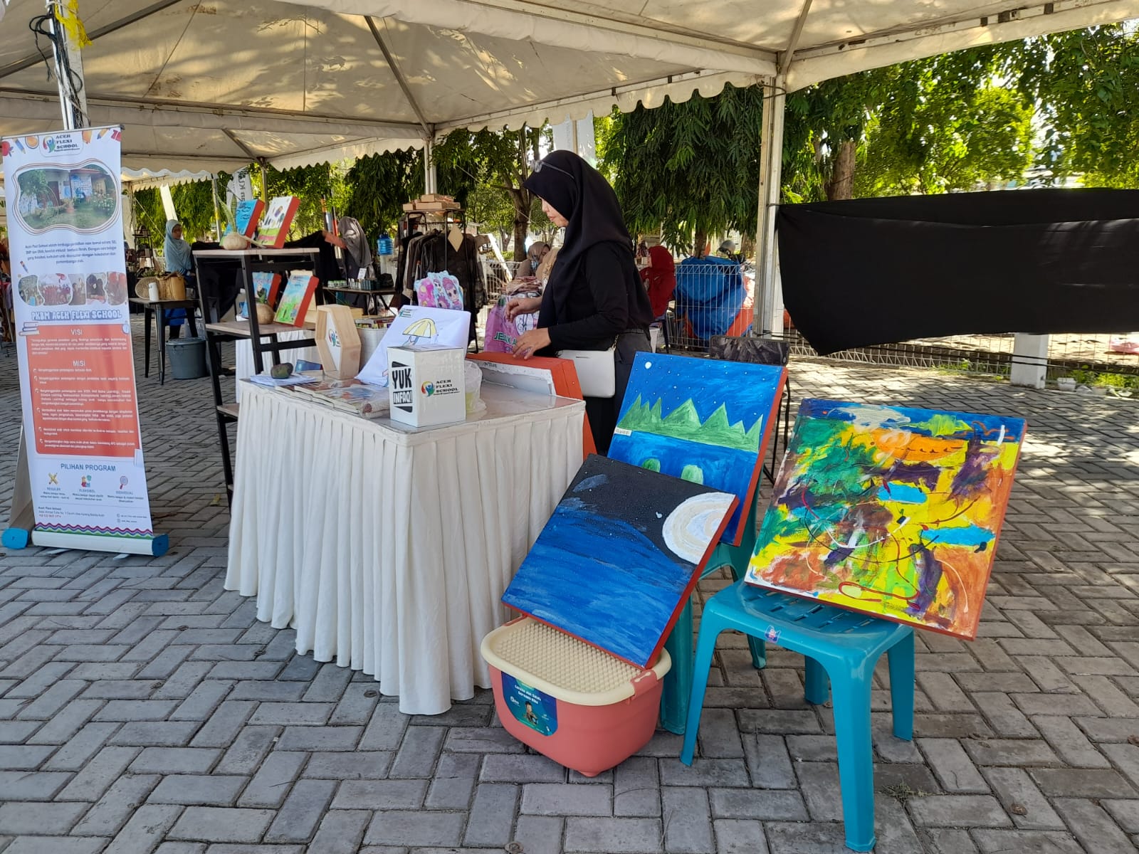 Banda Aceh- Pojok karya Anak Berkebutuhan Khusus (ABK) mewarnai kegiatan Aceh UMKM Berkah, Jum’at (29/9/2023). Melalui Aceh Flexi School, karya anak-anak ABK dipamerkan dalam kegiatan Aceh UMKM Berkah di Pasar Distanbun (Dinas Pertanian dan Perkebunan) Lampineung, Banda Aceh.