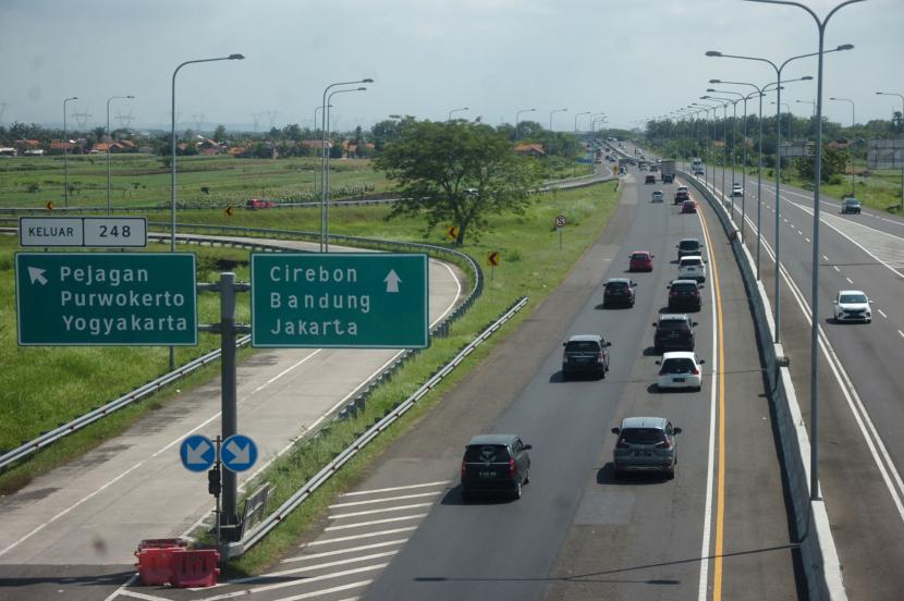 Kendaraan melintas di jalan tol Pejagan-Pemalang Brebes, Jawa Tengah, Kamis (5/5/2022). Pada H+3 Lebaran kendaraan arus balik dari arah Jawa Tengah menuju Jakarta terpantau ramai lancar.