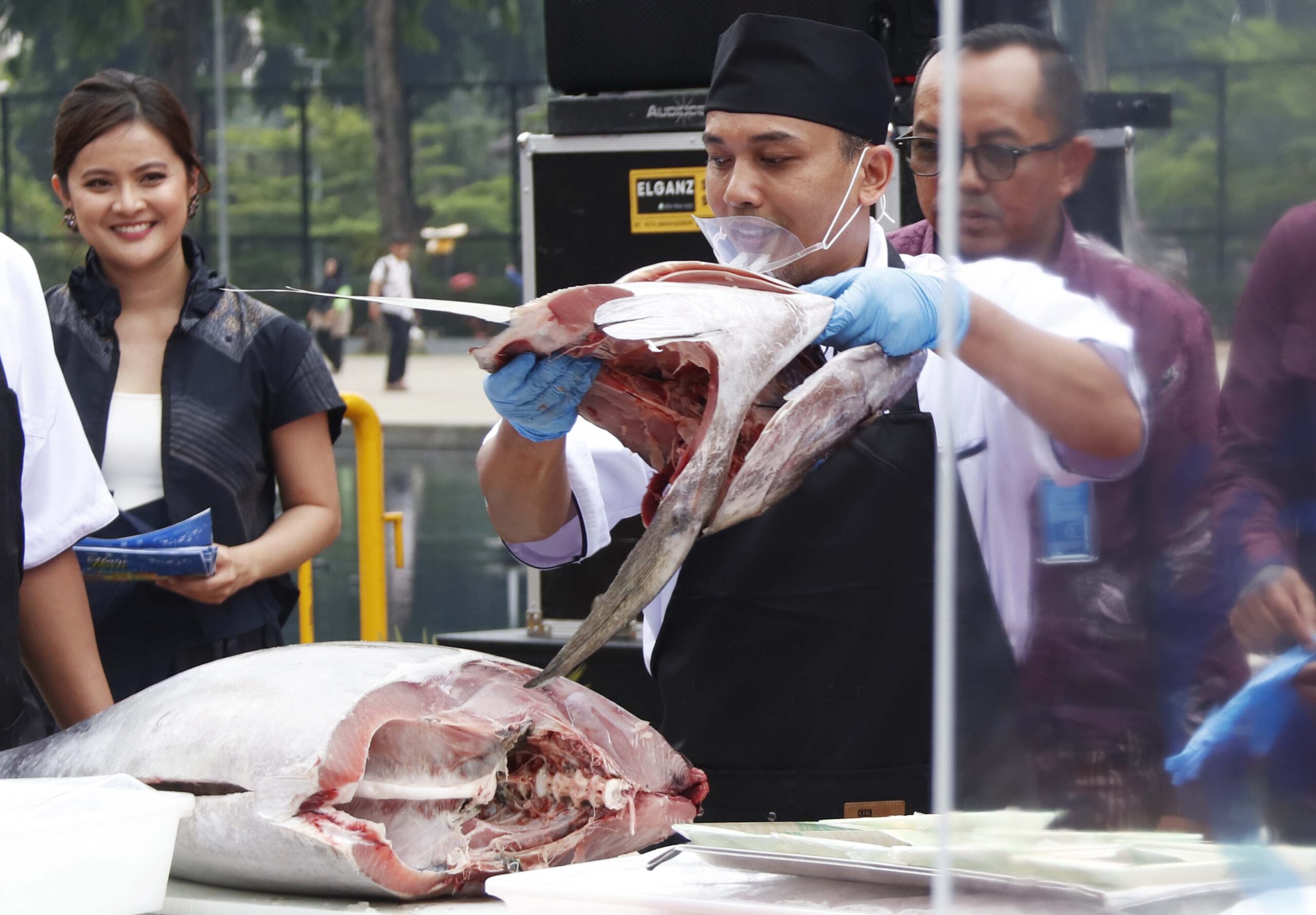 Seorang koki memotong ikan tuna dalam gelaran Hari Ikan Nasional 2023 lalu di lapangan banteng, Jakarta. Foto: Falahi Mubarok/Mongabay Indonesia