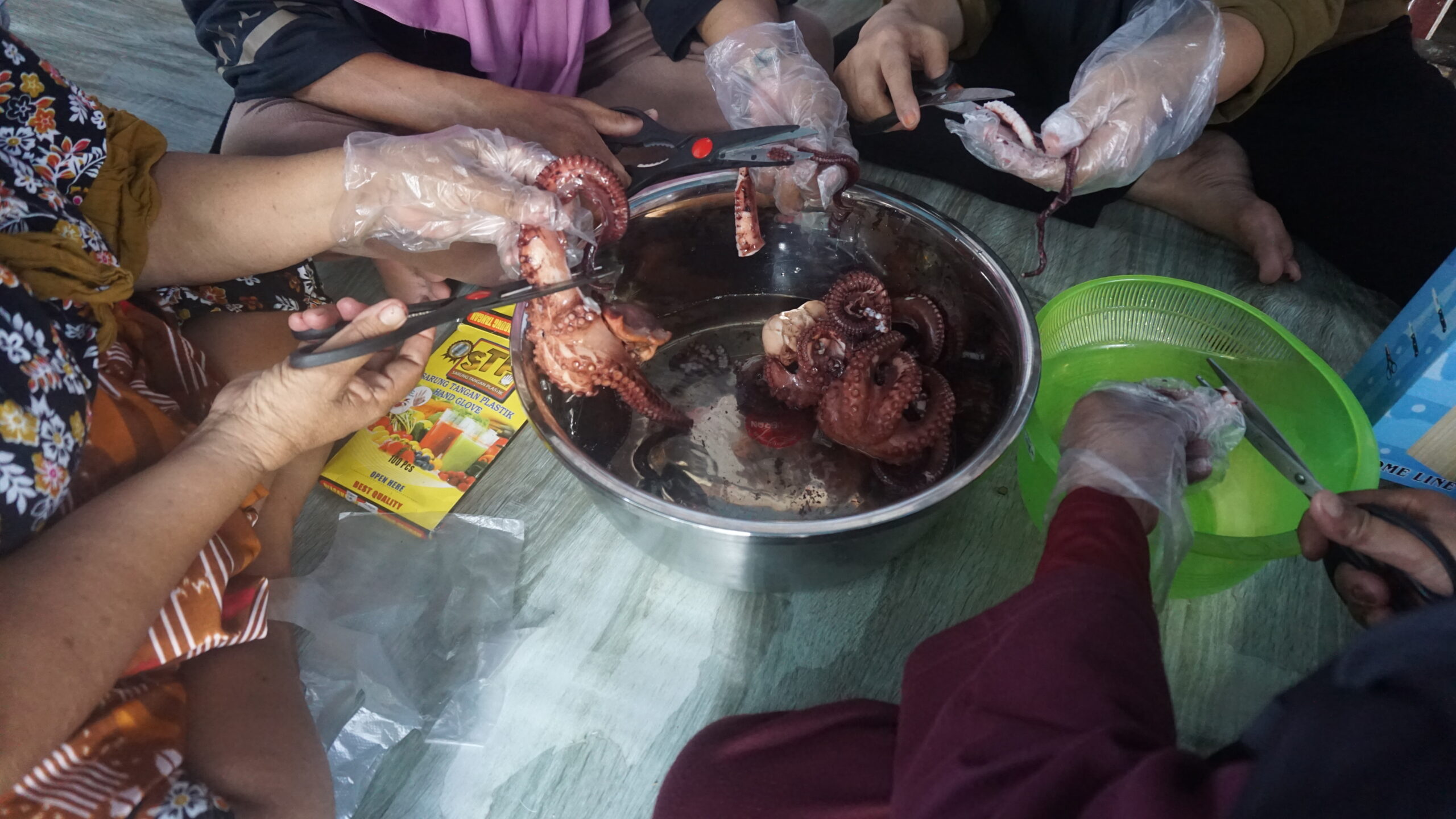 “Kita coba olah gurita yang ditolak, agar harganya tidak terlalu murah, padahal ukurannya besar-besar. Di awal memang telah disepakati bahwa gurita yang diolah adalah yang tertolak, dan bukan karena ukuran kecil yang sengaja ditangkap,” ujarnya.