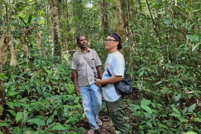 Arkilaus Kladit, pengurus Dewan Permusyawaran Adat Knasaimos (berkemeja) bersama Amos Sumbung, dari Greenpeace, di hutan adat Knasaimos, yang baru mendapatkan SK Pengakuan dan Perlindungan Wilayah Adat dari Bupati Sorong Selatan, Juni lalu. Foto: Sapariah Saturi/Mongabay Indonesia