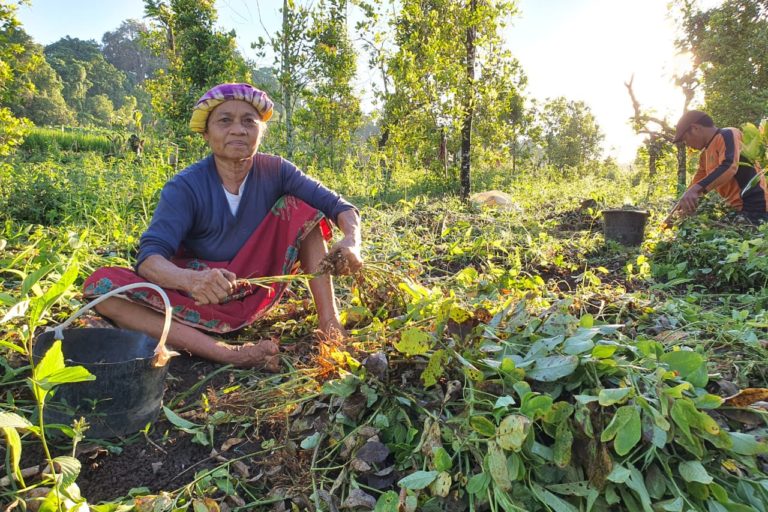 Perempuan petani sedang memanen kacang di kawasan Hutan Desa Campaga. Hutan telah memberi berkah ekonomi berupa air yang bisa mengairi sawah dan pertanian lain di sekitar kawasan hutan. Foto: Wahyu Chandra/Mongabay Indonesia.