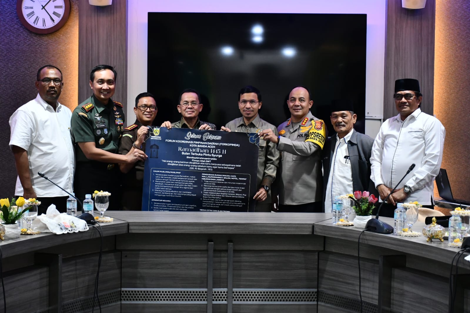 Penandatanganan seruan bersama tersebut, dilakukan dalam rapat yang digelar pada Rabu (6/3/2024) di balai kota. Rapat itu juga dihadiri oleh jajaran pejabat Pemko Banda Aceh seperti Asisten I Bachtiar dan Kadis Syariat Islam Ustaz Ridwan.