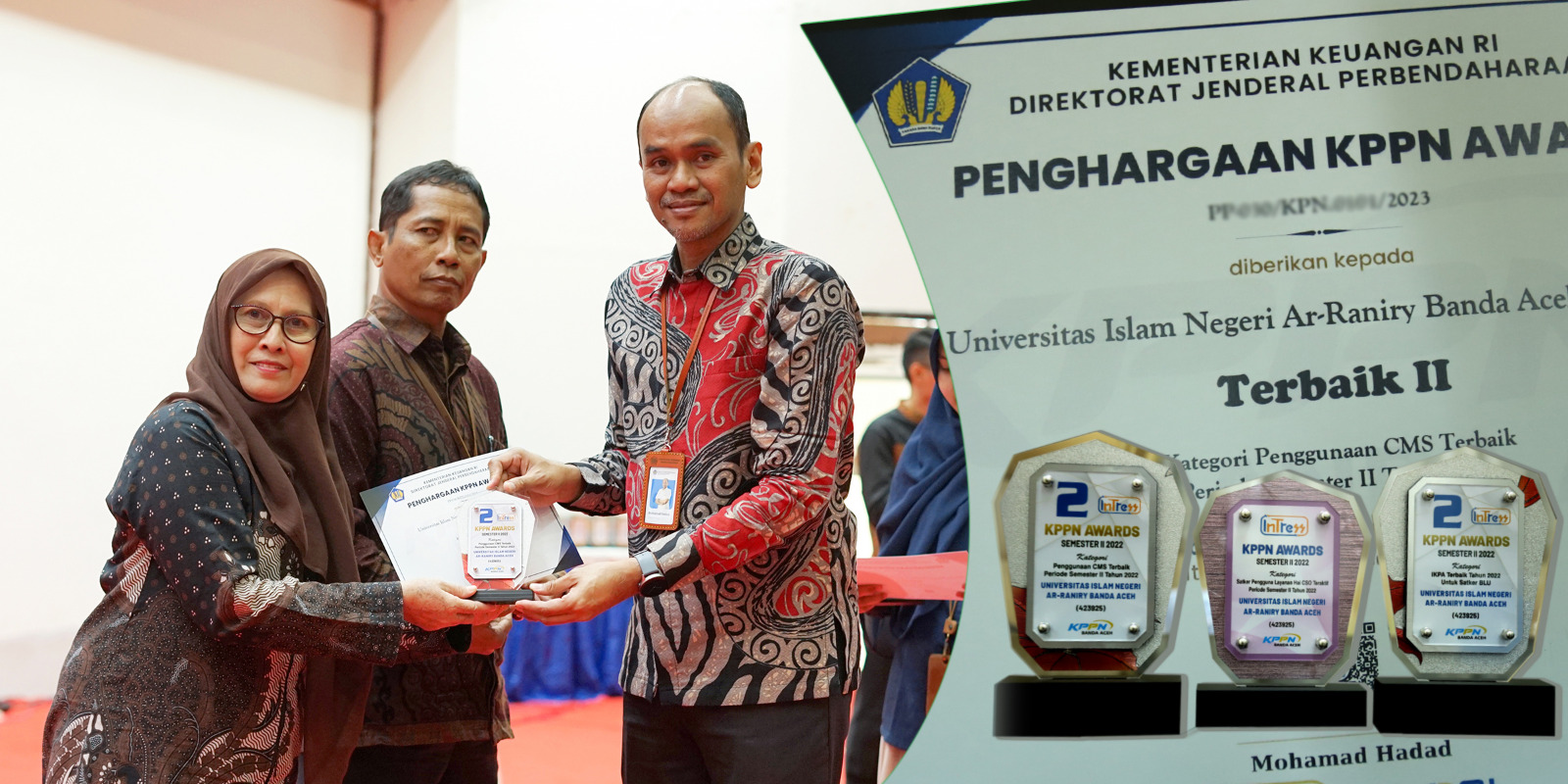 Tiga Penghargaan KPPN Awards yang terima UIN Ar-Raniry Banda Aceh yaitu, Terbaik II kategori penggunaan CMS terbaik periode semester II tahun 2022, Terbaik II kategori IKPA terbaik periode tahun 2022 untuk Satker BLU dan Terbaik IV kategori satker pengguna layanan Hai CSO teraktif periode semester II tahun 2022.