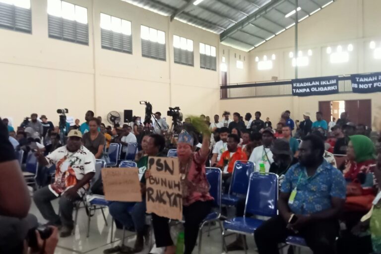 Aksi tandatangan warga menolak PSN di depan gedung pertemuan sebelum Wamen Kementerian HAM Mugiyanto masuk gedung pertemuan. Foto: Agapitus Batbual/Mongabay Indonesia