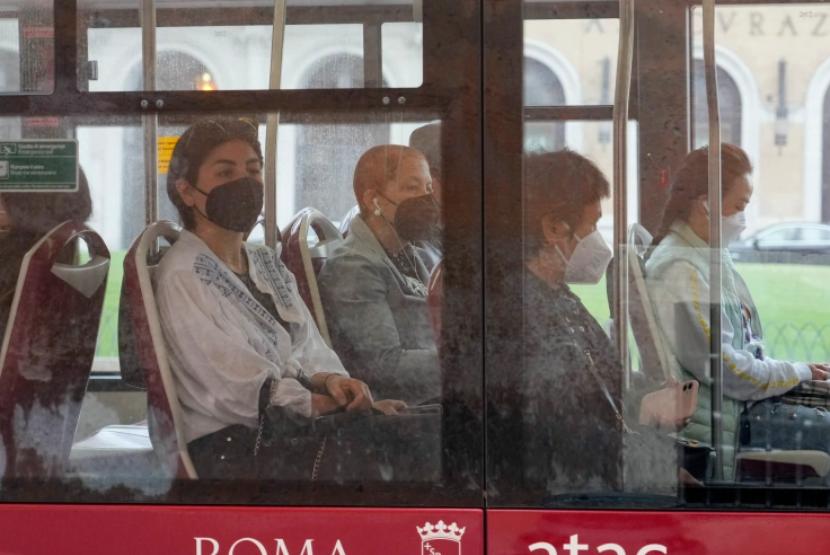 Orang-orang memakai masker saat mereka naik bus angkutan umum di Roma, Ahad, 1 Mei 2022.