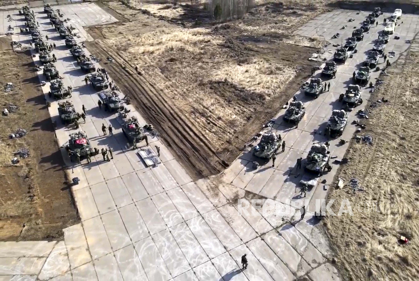 Foto ini diambil dari video yang didistribusikan oleh Layanan Pers Kementerian Pertahanan Rusia menunjukkan kendaraan militer Rusia bergerak selama latihan di Krimea, 22 April 2021.