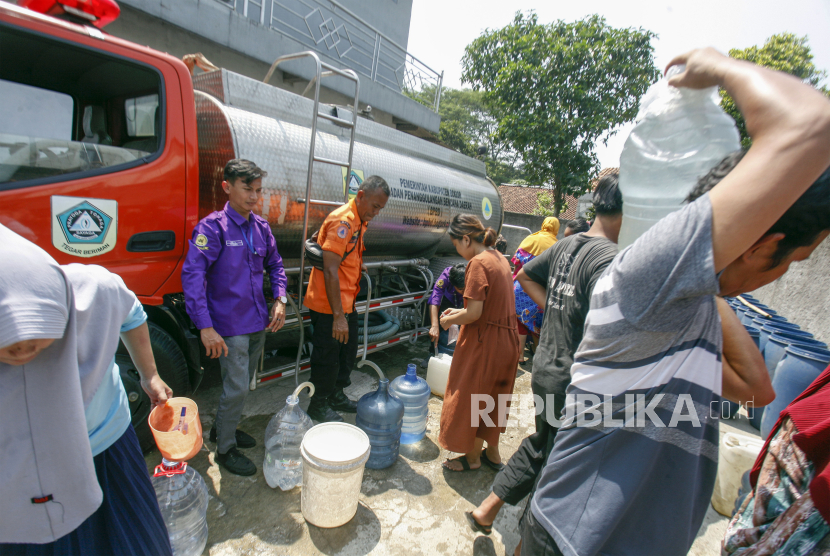 Petugas Badan Penanggulangan Bencana Daerah (BPBD) mendistribusikan air bersih kepada warga di Desa Sukahati, Citeureup, Kabupaten Bogor, Jawa Barat, Rabu (9/8/2023). BPBD Kabupaten Bogor telah menyalurkan 225.000 liter air bersih kepada warga Kabupaten Bogor yang terdampak kekeringan pada musim kemarau.
