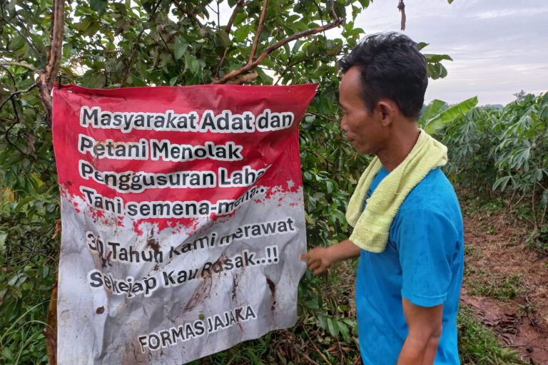 Spanduk penolakan alih fungsi lahan di Desa Iwul. Foto: Achmad Rizki Muazam/Mongabay Indonesia